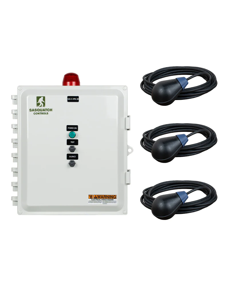 The Sasquatch SAS-S-1PH is a single phase control panel designed for use with one pump, rated for 120/208/240 VAC up to 25.0 FLA. Standard features include: NEMA 4X enclosure, motor and control circuit breaker, pump run light, alarm buzzer, 360-degree red beacon alarm light, and three mechanical floats. This control panel is UL listed and comes standard with a two-year limited warranty.